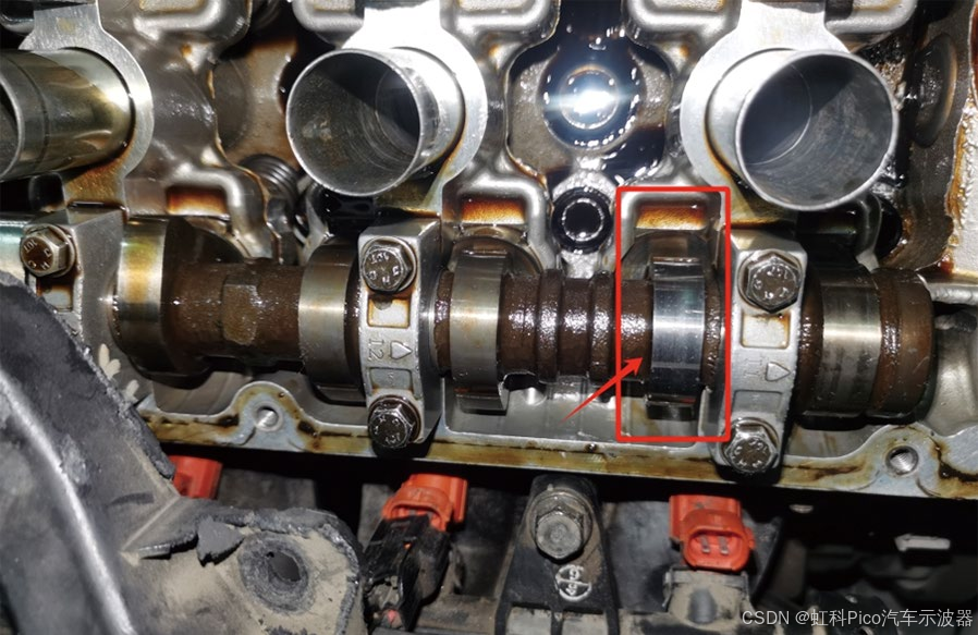拆下气门室盖,发现气缸1和气缸3的进气凸轮磨损异常(图4)。进一步检查发现,气缸1和进气3的进气凸轮紧紧压在气门挺筒上(图5),推断进气门间隙过小,导致进气门密封不良。转动曲轴,依次将气缸1和气缸3的活塞旋转至压缩上止点,然后依次从火花塞安装孔向气缸1和气缸3内打烟雾,结果发现气缸1和气缸3进气门均漏烟雾,由此确认气缸1和气缸3的进气门密封不良。