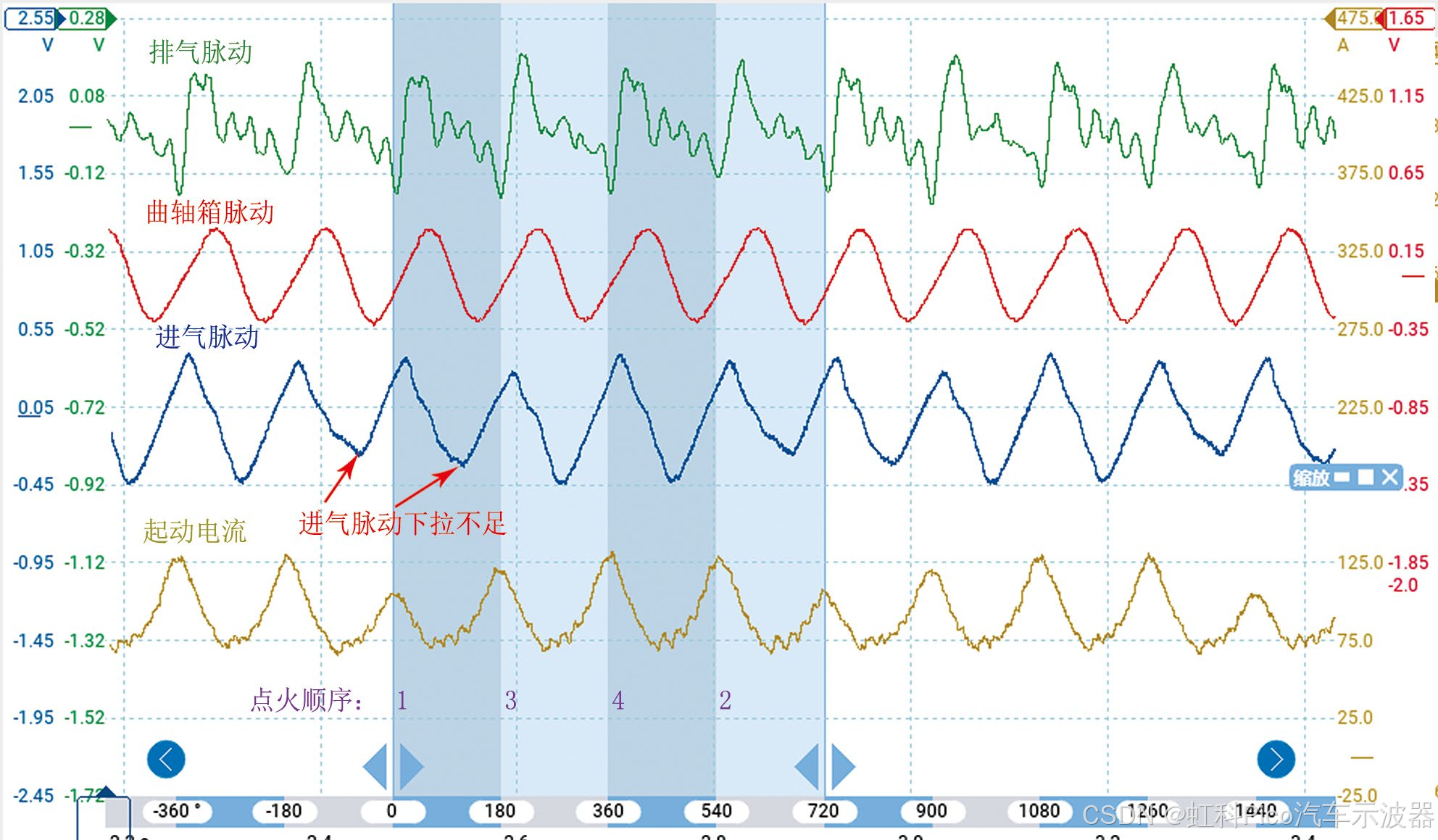 图3 起动时的进气脉动、排气脉动、曲轴箱脉动及起动电流波形