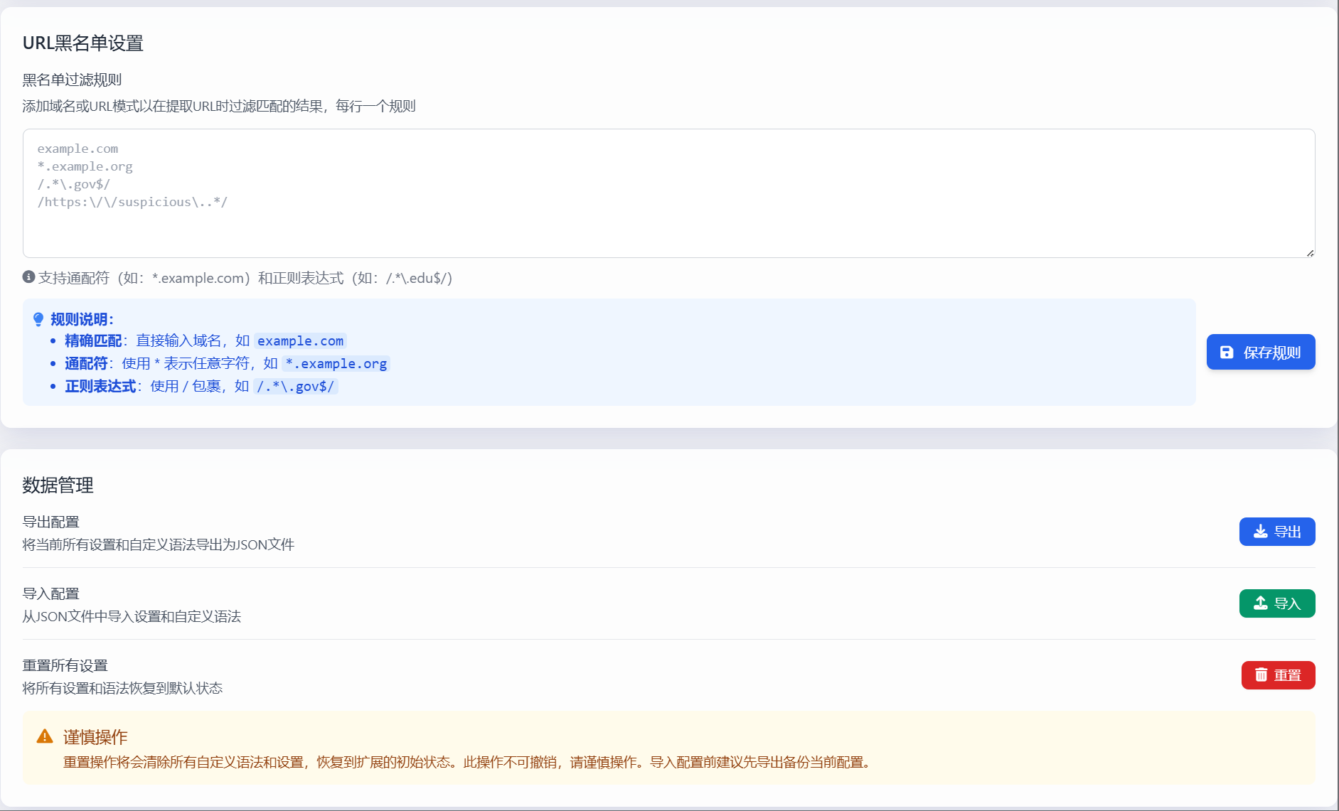 选项页面 - 基本设置,可配置侧边栏的开关、URL提取黑名单、导入导出配置、重置。