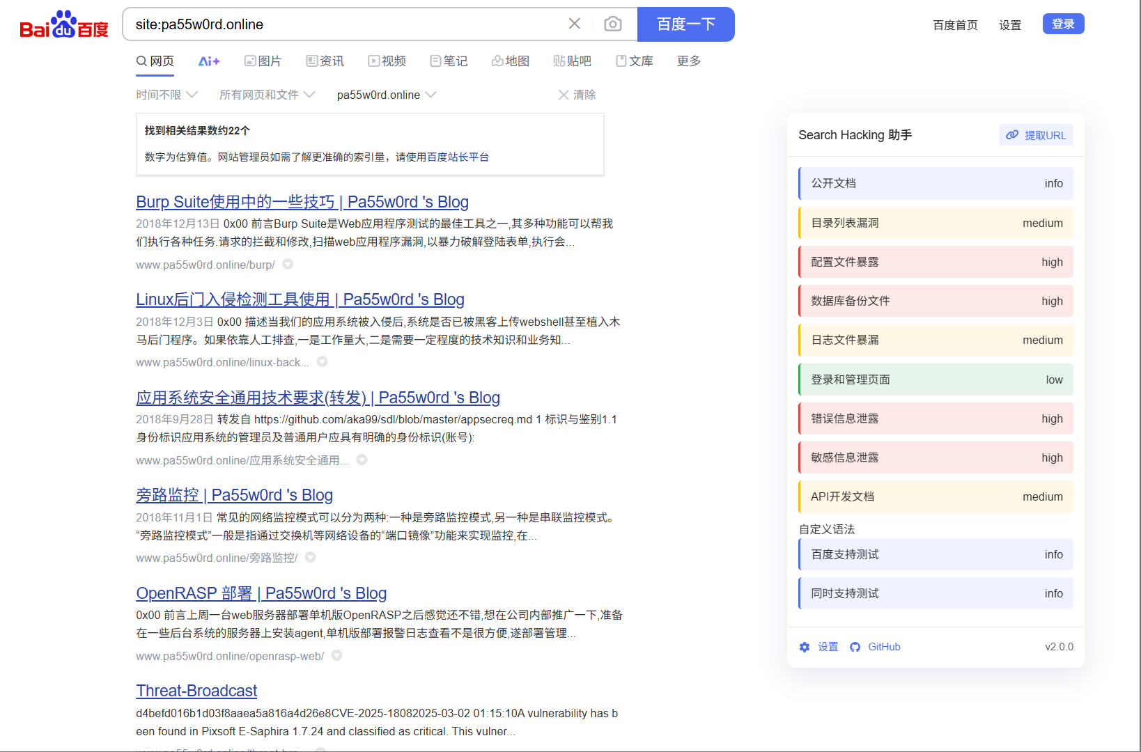扩展侧边栏在百度搜索结果页面,提供相同的 Hacking 功能。