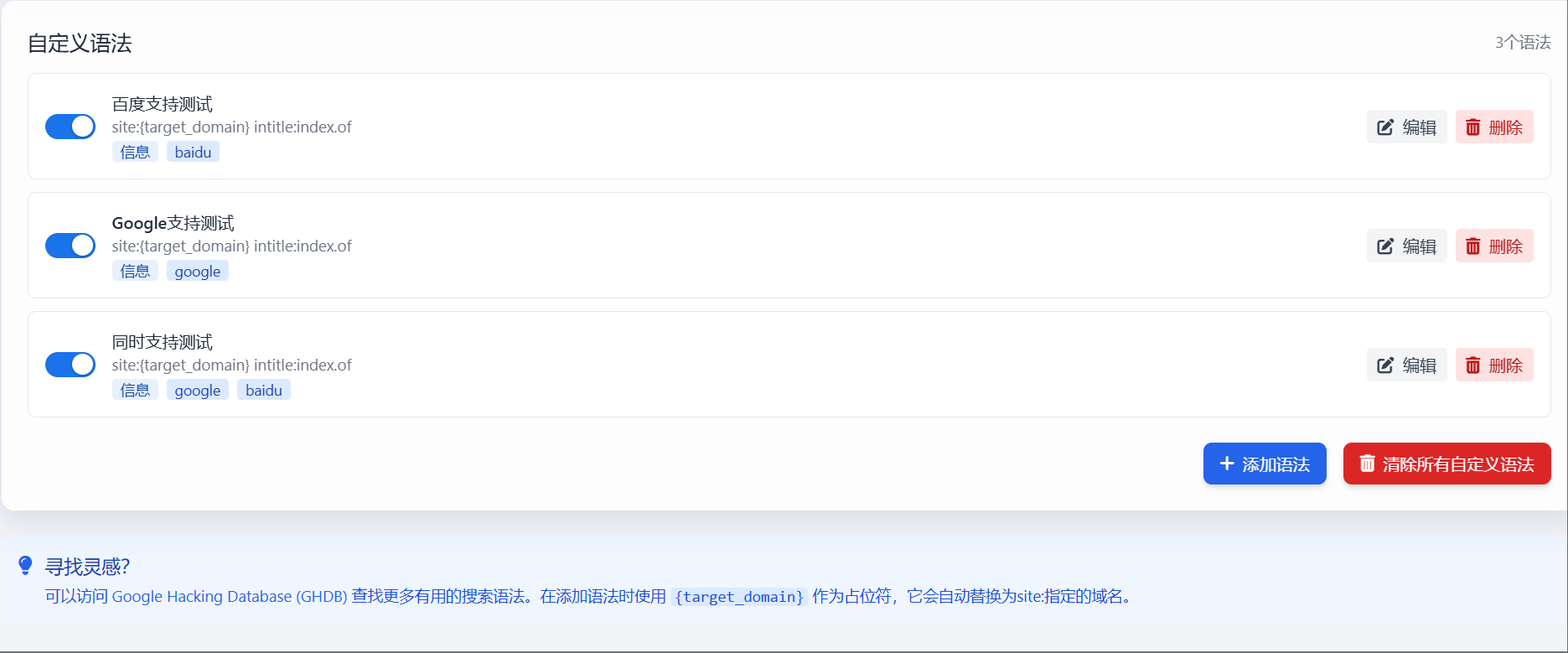 - 引擎选择:为每个语法选择支持的搜索引擎(Google/百度/Bing)