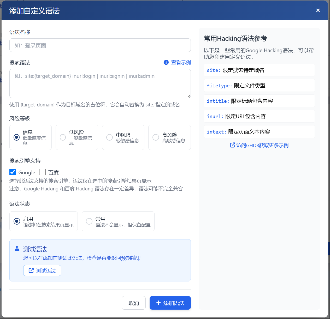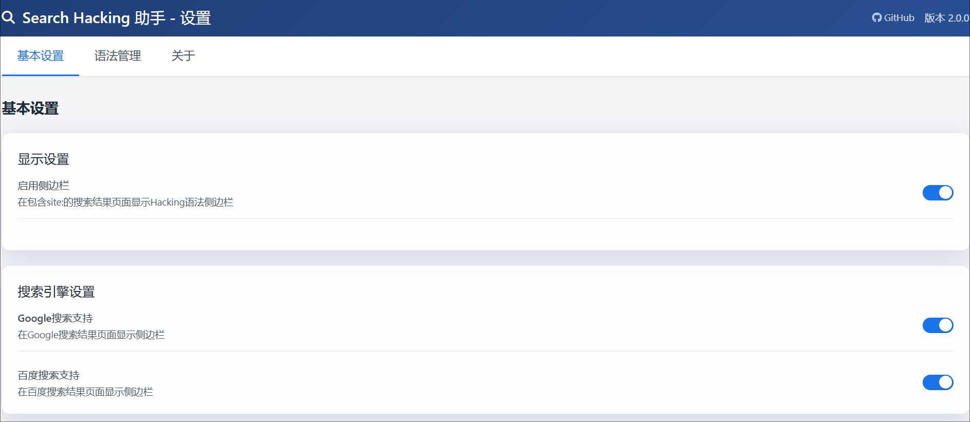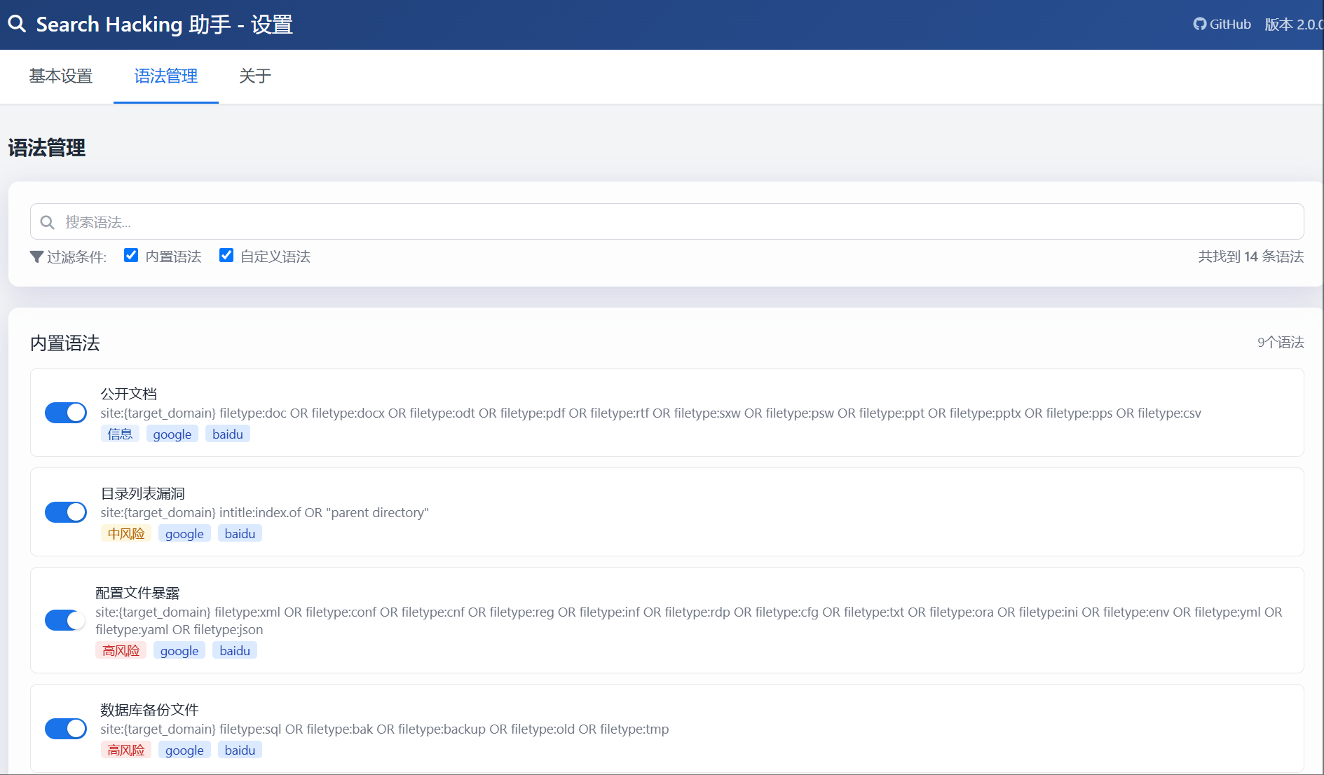 选项页面 - 语法管理,可管理内置和自定义的 Hacking 语法,选择支持的搜索引擎。