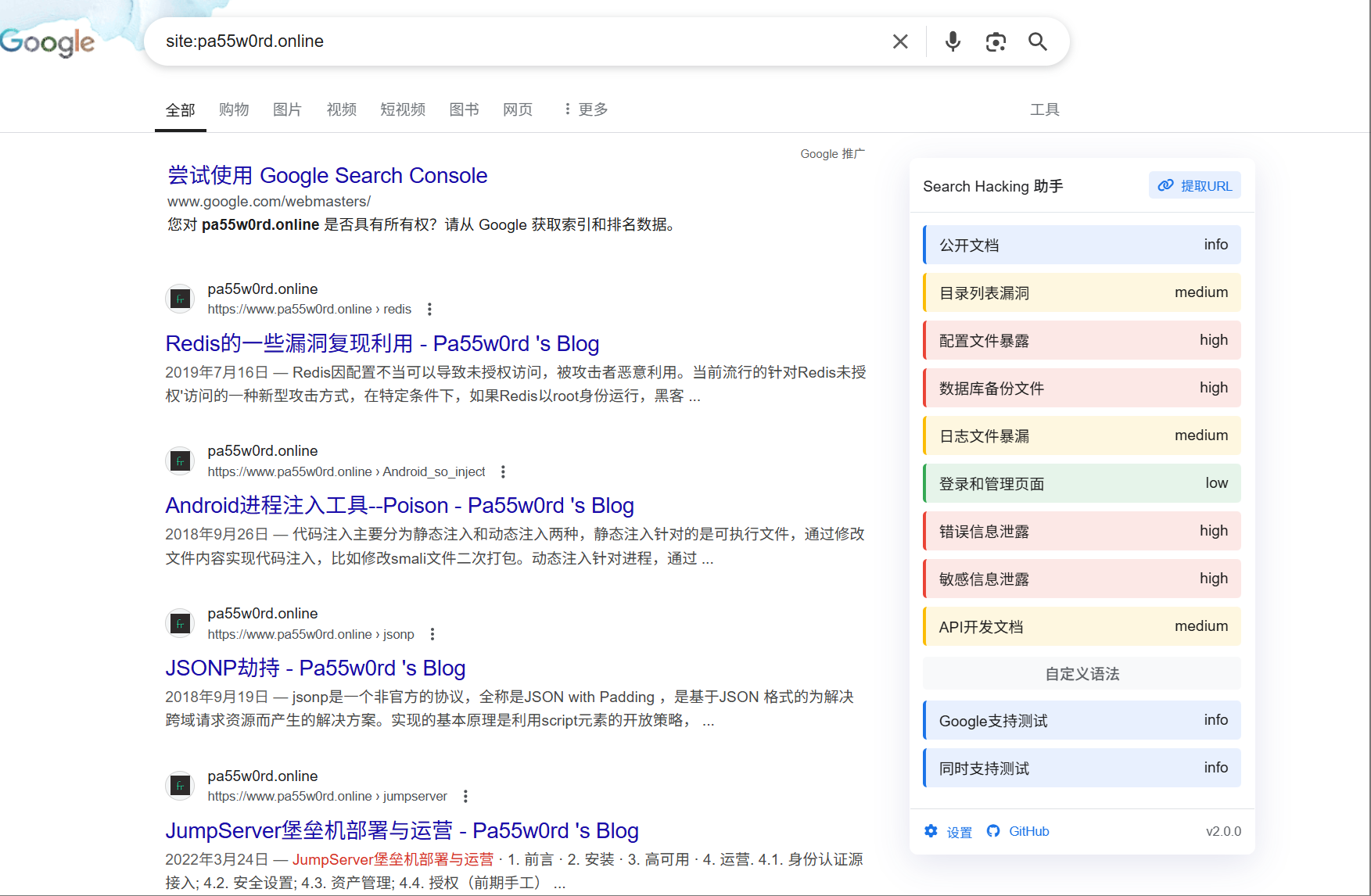 在 Google、百度、Bing 搜索结果页自动注入侧边栏,提供预定义和自定义的 Hacking 语法按钮。支持 site: