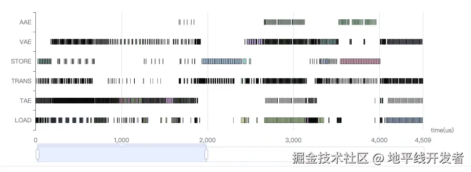 新增的 Timeline 功能通过时间序列图展示硬件操作耗时,横轴为时间(微秒),纵轴为操作类型(如 AAE、VAE、STORE 等)。关键应用包括: