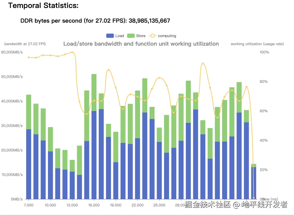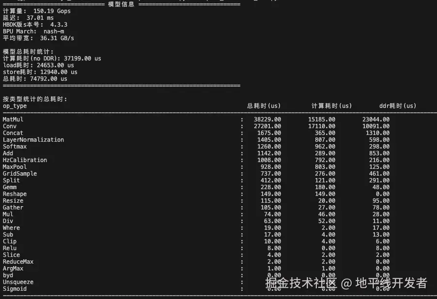 - 每种算子的总耗时、计算耗时和 ddr 耗时,有利于了解模型中算子的耗时分布和带宽占用;
