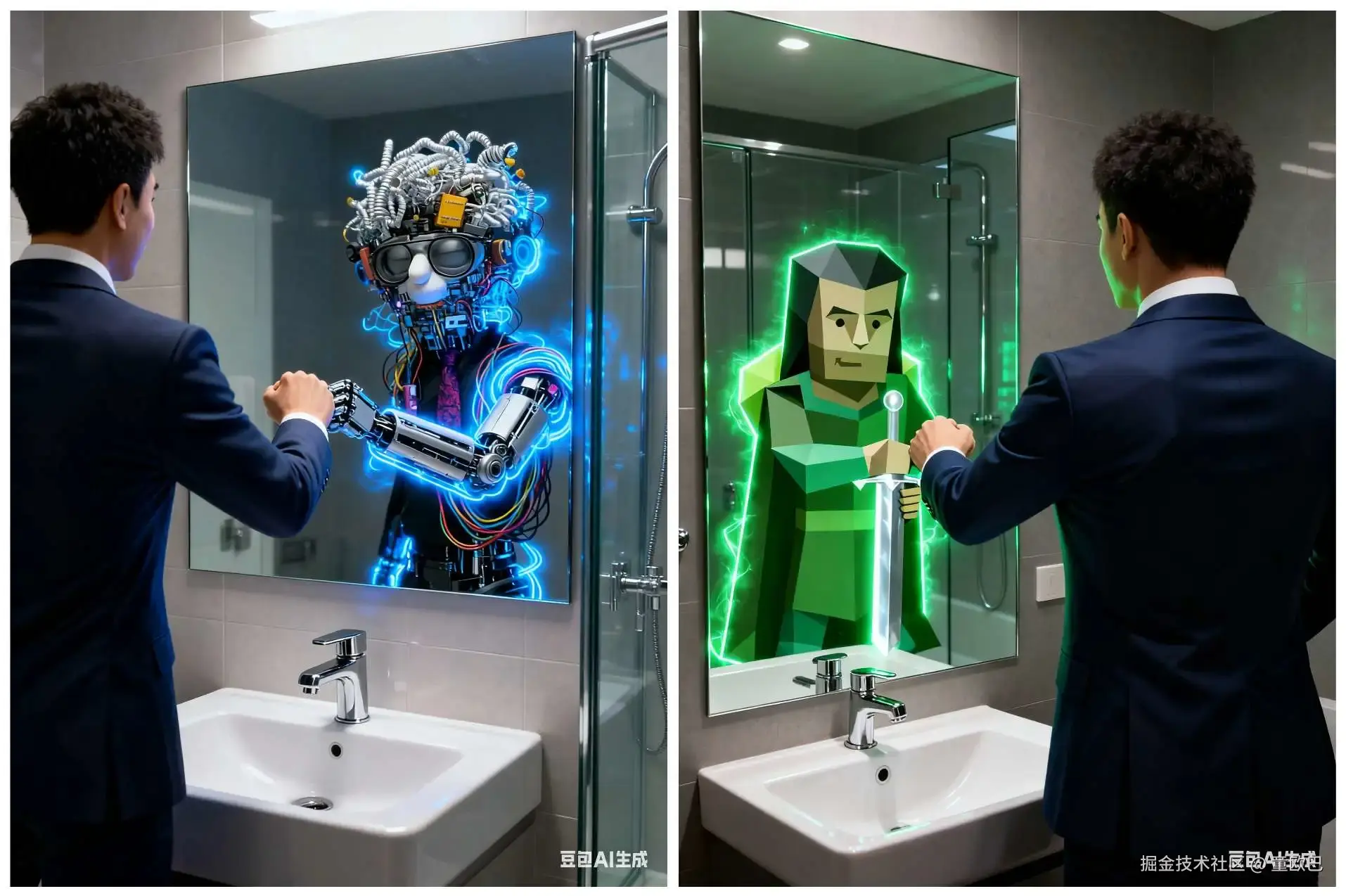 生成一张图片,画面左侧以图一的人物生成,是一位背对镜头的人物,正面向浴室镜子与镜中的浮现的形象碰拳,镜子里映出的是图二人物的形象,周身环绕着蓝色发光的特效,其他以照片为准,不做任何改变,场景是一间浴室,可见白色洗手池,银色水龙头,背景还有玻璃材质的淋浴间。整体光线偏暗,人物和浴室的现实部分,处于阴影与微光的对比。