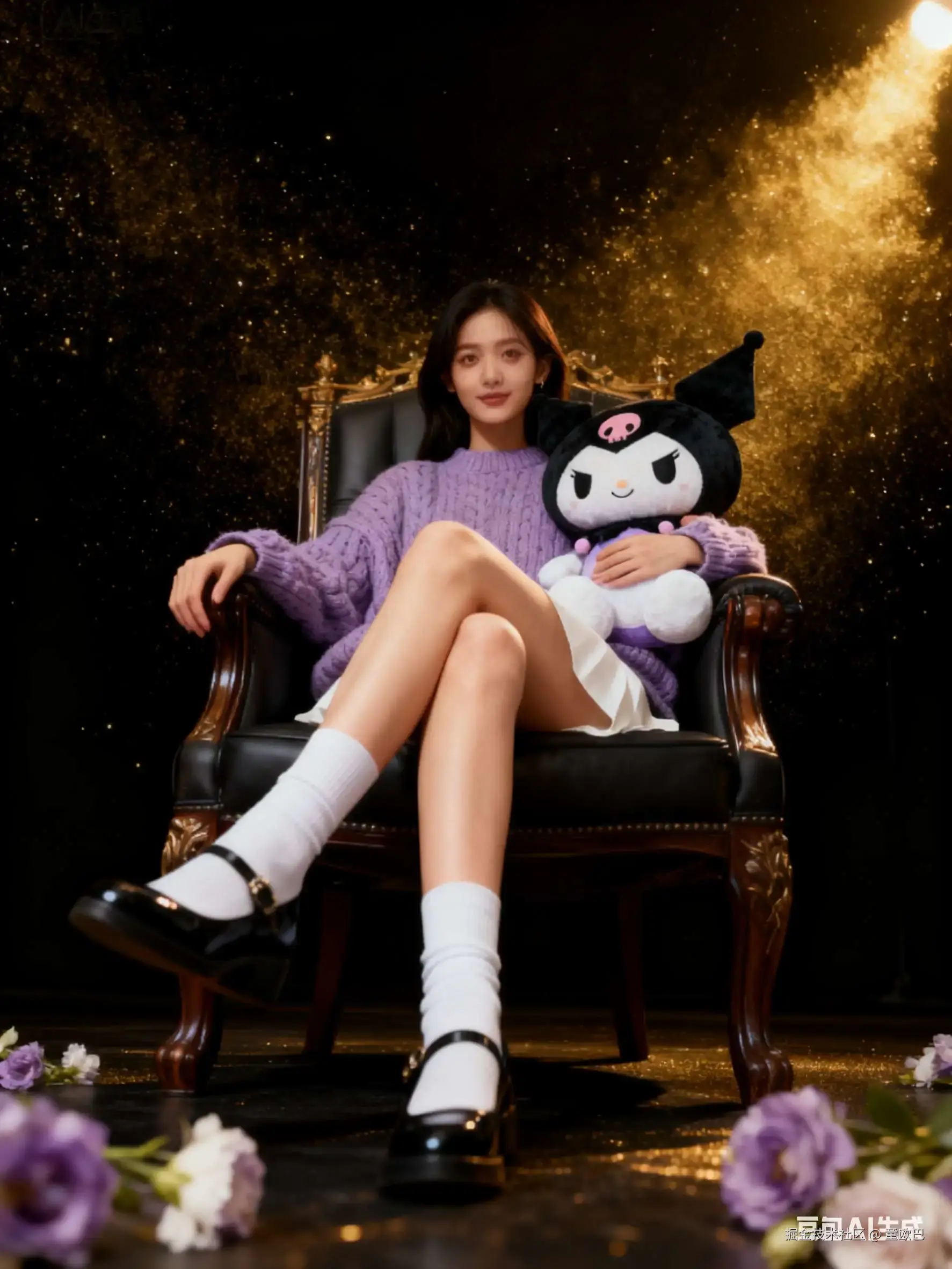 以人物鞋子为主题,让人物坐在椅子上,椅子要很权威的那种采用近大远小的构图和超广角视觉,从右上角往上低角度拍摄,突出鞋子在画面中的主体地位,增强空间感和视觉冲击力,人物整体姿态服装不变,背景要黑色的金光。翘二郎腿比例保持 3:4。