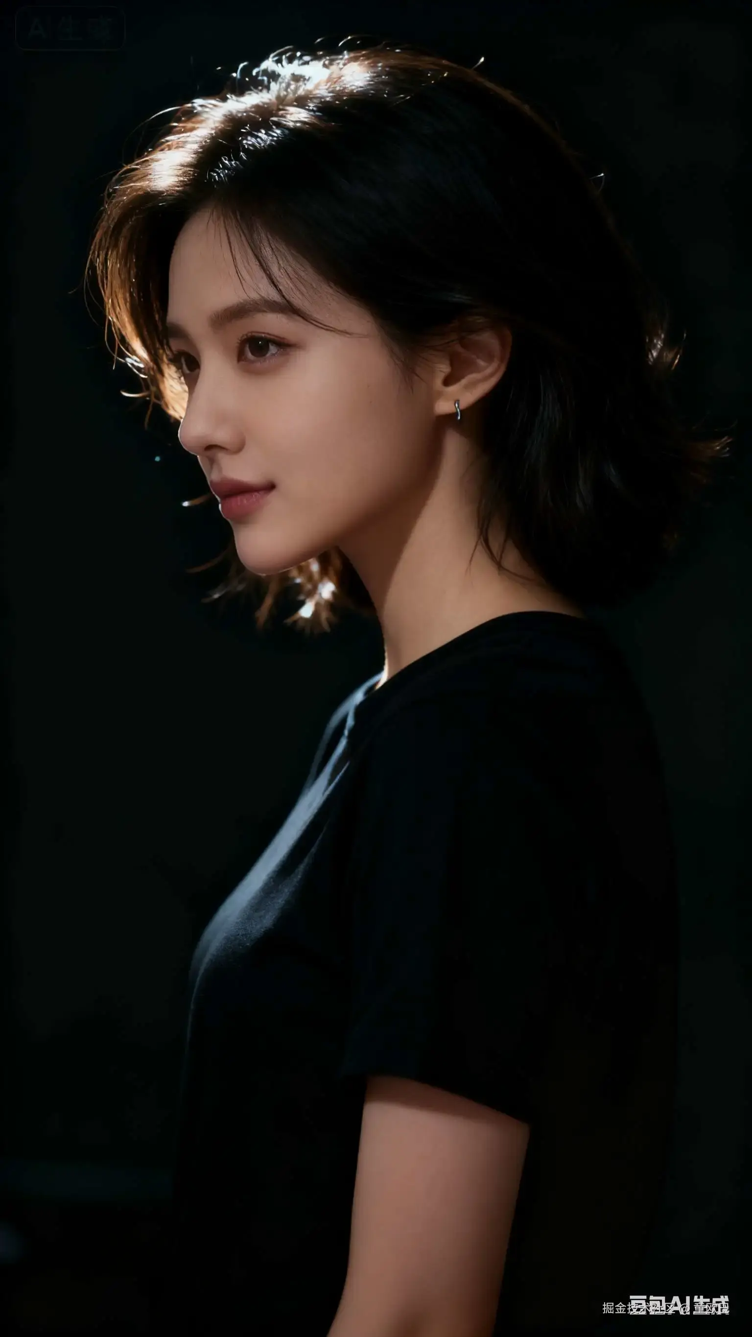 以图一的人物生成一张侧面半身肖像,采用深暗背景营造强烈对比。光线自侧上方倾泻,勾勒出发丝,半边脸颊与黑色上衣的轮廓,蓬松的发梢泛出细腻光泽。另一侧面容隐入暗部,仅由微妙的明暗过渡暗示面部结构。人物身着简约黑色圆领上衣,在浓郁阴影中凸显身形轮廓。整体以写实手法融合艺术感,通过光影的戏剧性塑造,传递出冷峻而神秘的气质,突出立体感与氛围张力。