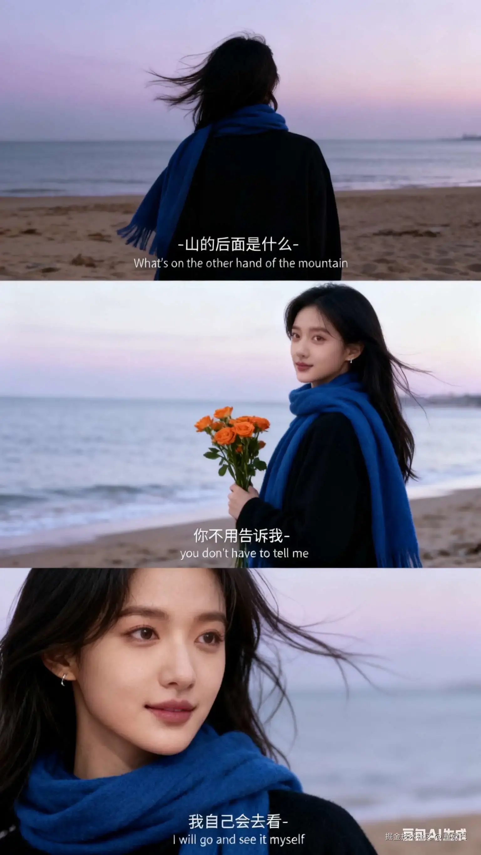 一组三宫格艺术感写真图,海边写真图,三张图合成一个三宫格。场景为海边沙滩,天空呈淡紫与灰色渐变,海面平静。画面中有人物和参考图一致,穿着黑色上衣,搭配蓝色围巾,人物和脸不变。第一张为近景,站在沙滩上的背影,头发被风吹起,添加中英字幕"山的后面是什么 What's on the other hand of the mountain",第二张是手持橙色花束,侧身站立于海边,添加中英字幕"你不用告诉我 you don't have to tell me",第三张是特写,头发随风飘动,添加中英字幕"我自己会去看 I will go and see it myself"。整体色调清冷,营造出文艺且充满自我探索情绪的氛围。