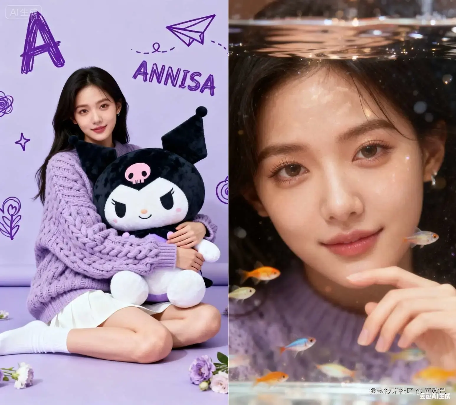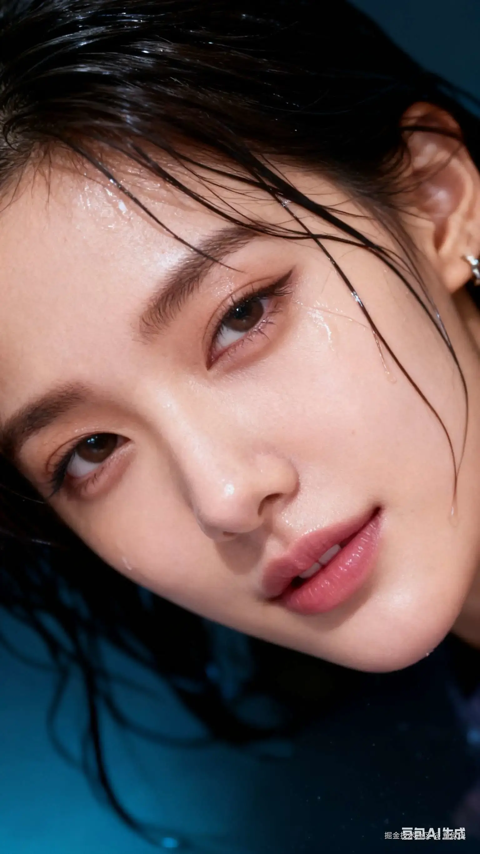 以图一的人物生成一张水后时尚人像,面部大特写,极近距离拍摄,眼神直视镜头,神态自然松弛,清透水感妆容,睫毛根根分明,肤质细腻通透,微光在面部高光浮动。人物和数尾迷你热带小鱼在鱼缸前景缓缓穿梭,尾鳍透明灵动,人物用手指和小鱼互动。水面折射出晃动光纹,碎光斑点在脸庞跳跃,水下漂浮粒子环绕,透明水肌理清晰反光。整体氛围梦幻安静,棕黑色系暗调,高级感浓厚,漂浮失焦、动态模糊与细腻胶片颗粒交错,光影写意杰作。整体就是人物在鱼缸玻璃后,和小鱼互动。