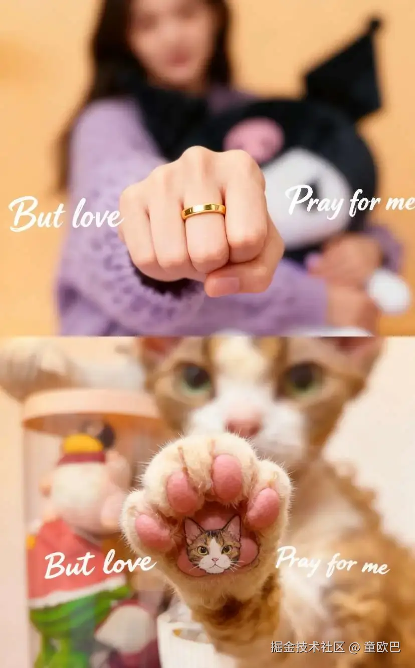 以这只小猫为原型,向前伸出小手爪,粉粉的爪子肉垫居于画面中间位置,肉垫上有萌萌的小猫图案。爪子左侧有白色手写体英文"But love",右侧有白色手写体英文"Pray for me",两段英文与爪子处于同一水平线且紧密挨着。小猫看向镜头,小猫面部虚化,背景呈暖色调并采用柔焦效果,整体风格为写实摄影,画面长宽比协调,营造出一种聚焦于爪子细节的视觉效果。