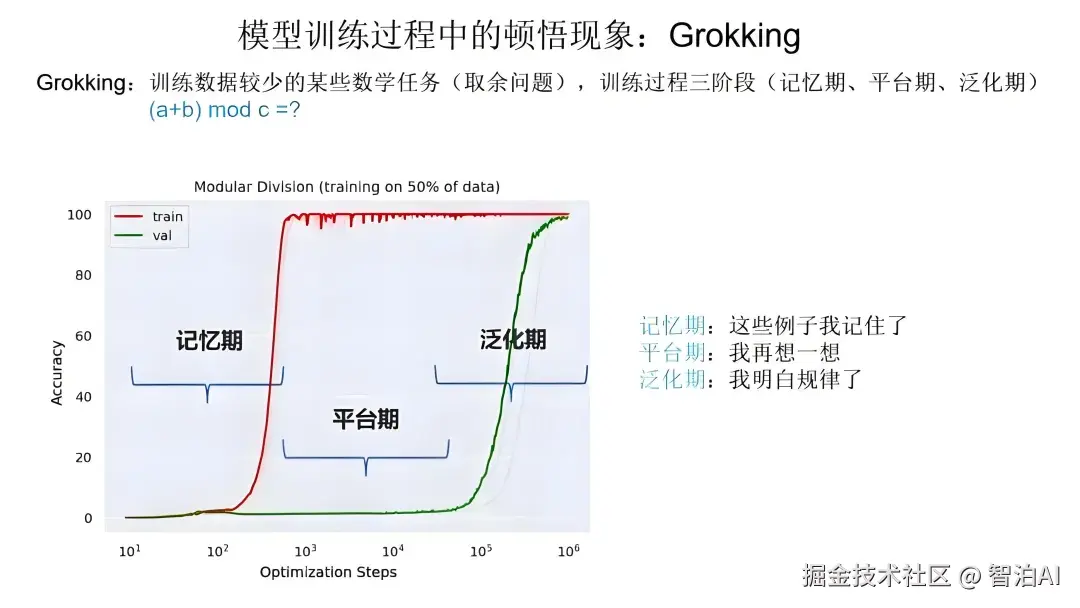 接着是平台期,验证集效果持续低迷,模型仍未掌握规律;最后是泛化期,验证集效果突然提升,表明模型顿悟,学会任务规律,实现从记忆到泛化的转变。