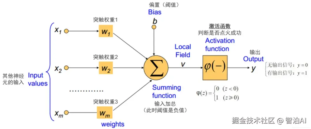 b是偏置(bias),影响神经元的激活阈值,即神经元对输入信号的敏感程度。