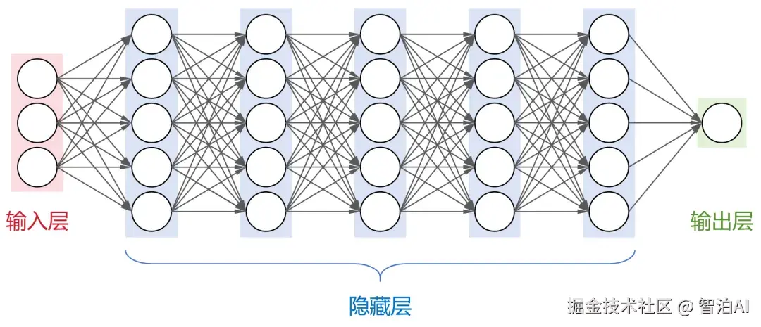 隐藏层:多个中间层,每层神经元与下一层的所有神经元都有连接(即全连接神经网络),负责数据的特征提取和转换。