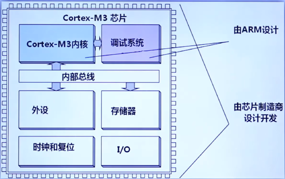 MCU 通常是一 个大的系统级芯片,他把 CPU、SRAM、FLASH 都集成到了这个芯片中(和电脑不一样,电脑这三个都是分开的),内部的完整构成为:CPU + 存储器 + 外设控制器 + 时钟系统 + 总线矩阵 + 电源管理 。