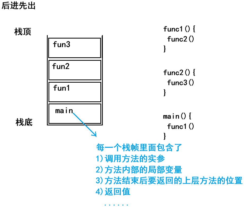 栈包含了方法的调用关系(栈帧),如果栈帧太多了会导致栈溢出。比如,递归结束条件有错误,导致无限递归