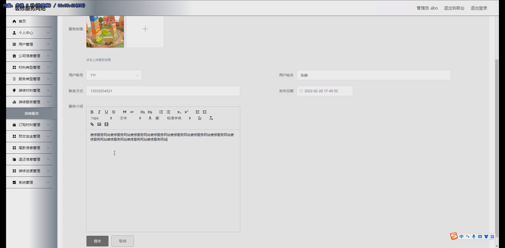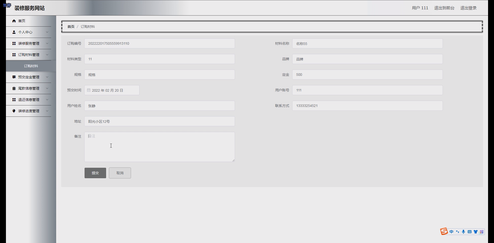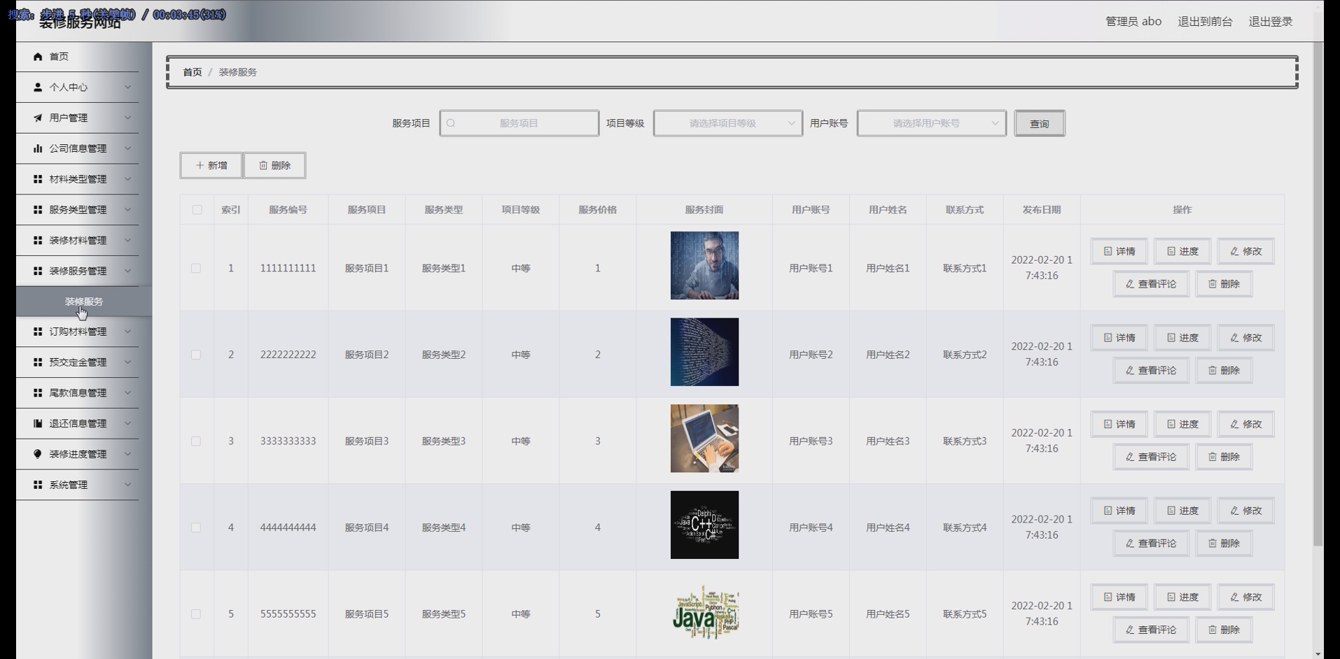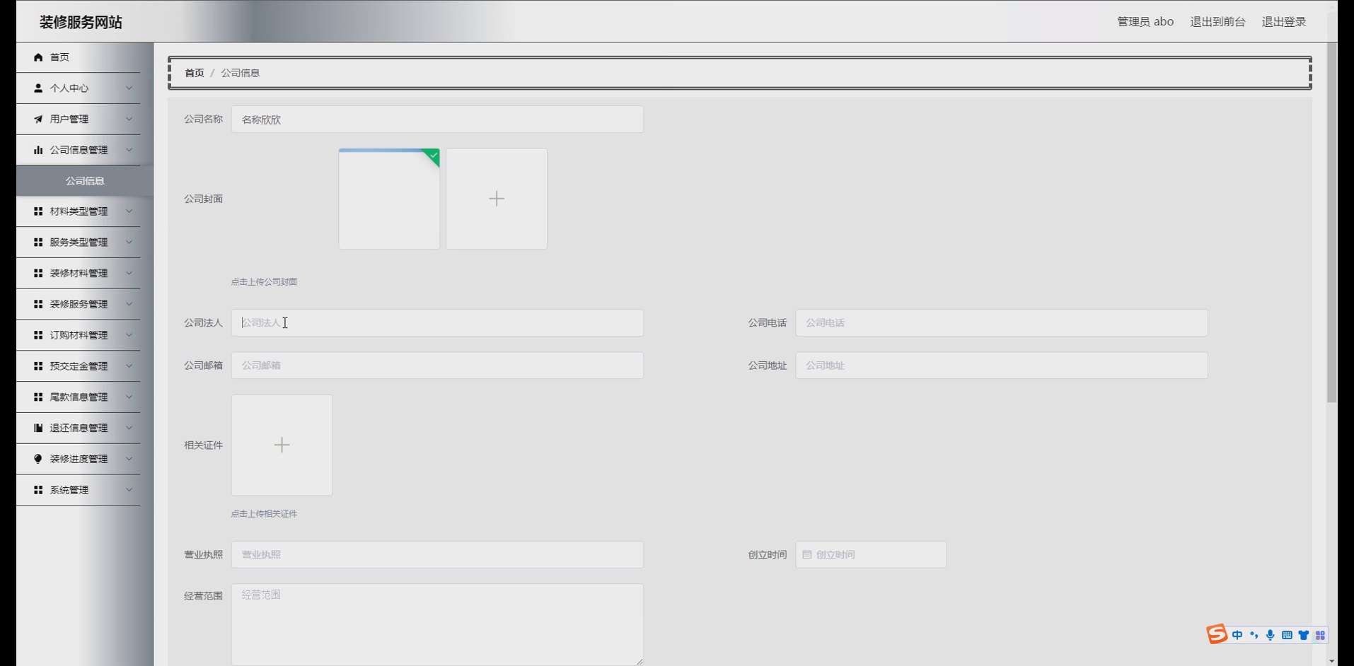 系统项目功能有:用户,公司信息,对话框,材料类型,装修材料,装修服务,服务类型,装修进度,订购材料,退还信息,预交定金,尾款信息