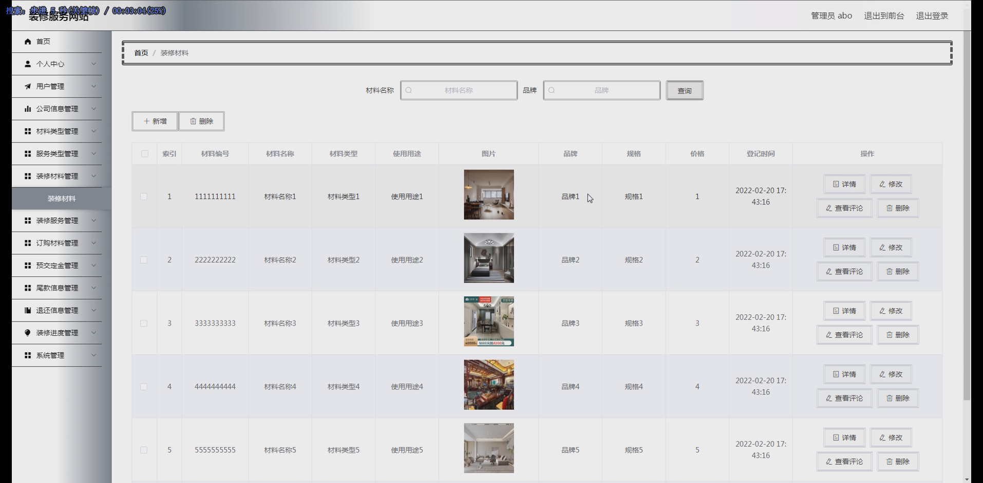 - 材料管理模块:包含材料类型分类(如瓷砖、板材、涂料)与装修材料详情(规格、价格、库存),支持用户查看与对比。