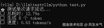它的结果如下,可以看到,我们成功使用vllm部署了模型并对外提供服务,对于非流式接口,生成速度是0.63token/s: