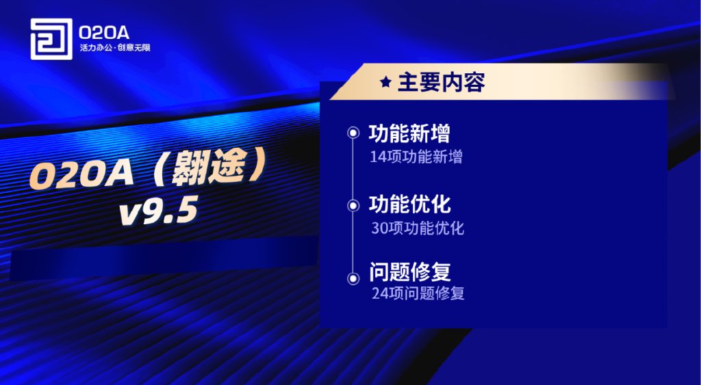 在本次版本中,O2OAv9.5 发布围绕架构稳固、性能提速、功能深拓、移动端体验与安全合规 五大维度进行系统升级;在流程平台、数据中心、内容管理、移动端、工具链与平台应用等多个层面给到"可感知"的改进。对**"稳定、性能、可控、安全、易用"**五大关键词进行系统性升级。我们既补强底层能力(验证码机制、分页阈值、安全默认策略、主键定义等),也带来流程引擎、表单、内容管理、数据中心、移动端与工具链的多项新功能与体验优化。同时,我们集中修复了一批影响日常使用的细节问题,让升级后的一线体验更加顺滑。