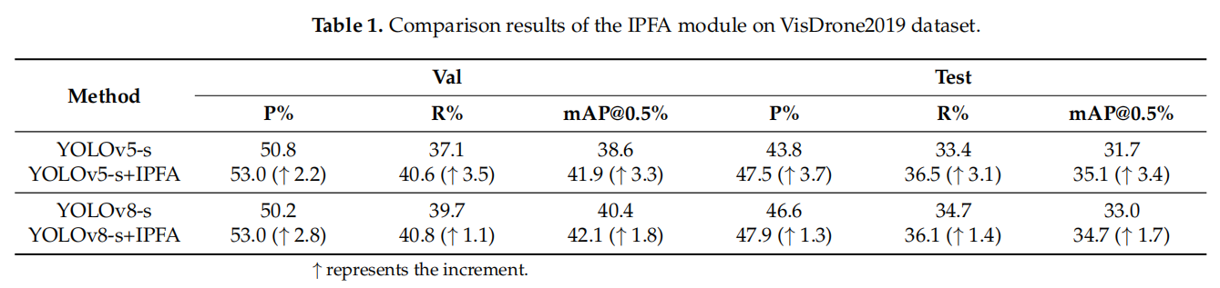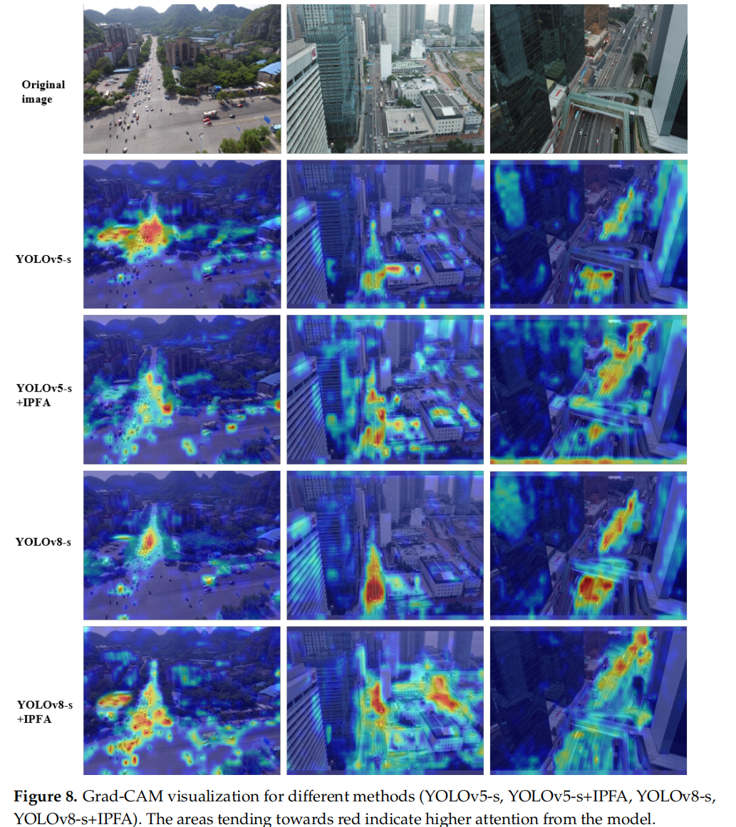 表 1 展示了使用 IPFA 模块前后的效果。使用 IPFA 模块有助于提高模型检测精度。在 VisDrone2019-val 数据集上,引入 IPFA 模块使 YOLOv5-s 模型的 mAP@0.5 提高了 3.3%,YOLOv8-s 模型提高了 1.8%。这表明 IPFA 模块具有优越的优化能力。这主要是由于 IPFA 模块能够在创建语义特征表示的同时保持目标的固有特征,从而增强模型检测小目标的能力。在 VisDrone2019-test 数据集上,IPFA 模块使 YOLOv5-s 和 YOLOv8-s 模型的 mAP@0.5 分别提高了 3.4% 和 1.7%。这表明 IPFA 模块表现出色的泛化能力。图 8 更直观地展示了 IPFA 模块带来的改进。图 8 的第一行显示了从不同光照和场景条件下从无人机视角拍摄的图像。图 8 的第二行展示了使用梯度加权类激活映射(Grad-CAM)生成的 YOLOv5-s 的热力图。图 8 的第三行展示了使用 Grad-CAM 生成的带有 IPFA 模块的 YOLOv5-s 的热力图。同样,图 8 的第四行代表使用 Grad-CAM 生成的 YOLOv8-s 的热力图,图 8 的最后一行显示了使用 Grad-CAM 生成的带有 IPFA 模块的 YOLOv8-s 的热力图。与图 8 的第二行相比,图 8 的第三行显示更多小目标被更深的红色区域覆盖,同时在无目标区域的红色覆盖减少。同样,在比较图 8 的第四行和最后一行时也出现了相同的模式。这些观察表明,带有 IPFA 模块的模型对小目标区域表现出更高的关注度,并减少了对无关区域的关注,从而验证了 IPFA 模块的有效性。