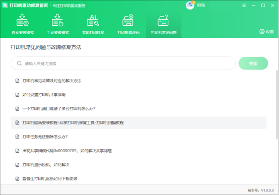 除了强大的修复功能,软件还整合了一个丰富的常见问题知识库,可以通过关键词搜索,查阅如"如何设置打印机共享"、"打印任务无法删除怎么办"等实用指南,边解决问题边学习,成为打印机维护小能手。