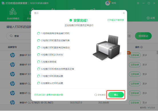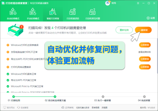 无论是驱动缺失、版本陈旧、驱动文件损坏,还是常见的系统打印服务异常、端口配置错误,软件都能智能检测,针对检测出的问题,只需点击"一键修复",软件便会自动完成驱动卸载、安装、系统配置优化等一系列操作,大大提升修复效率。