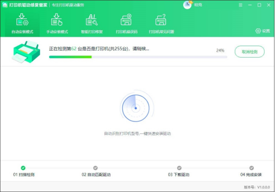 软件启动后,会深度扫描电脑系统环境以及已连接的打印机设备,能精准识别打印机的品牌、具体型号,并匹配你的操作系统版本的驱动,自动完成驱动的下载、安装,省去了你手动搜索、下载和选择的繁琐过程。