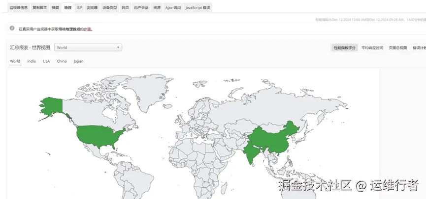 真实用户监控(RUM)能够通过实时见解增强网站的数字最终用户体验。它根据实际流量,从全球不同地点全天候监控网站的前端性能,跟踪关键指标,并提供有关真实用户如何与网站互动的深入见解。它根据浏览器、设备、ISP、地理等参数提供有关网站性能的详细信息。可以查看前端、后端和网络响应时间,还可以深入了解网络事务、用户会话、AJAX调用、Javascript错误等。