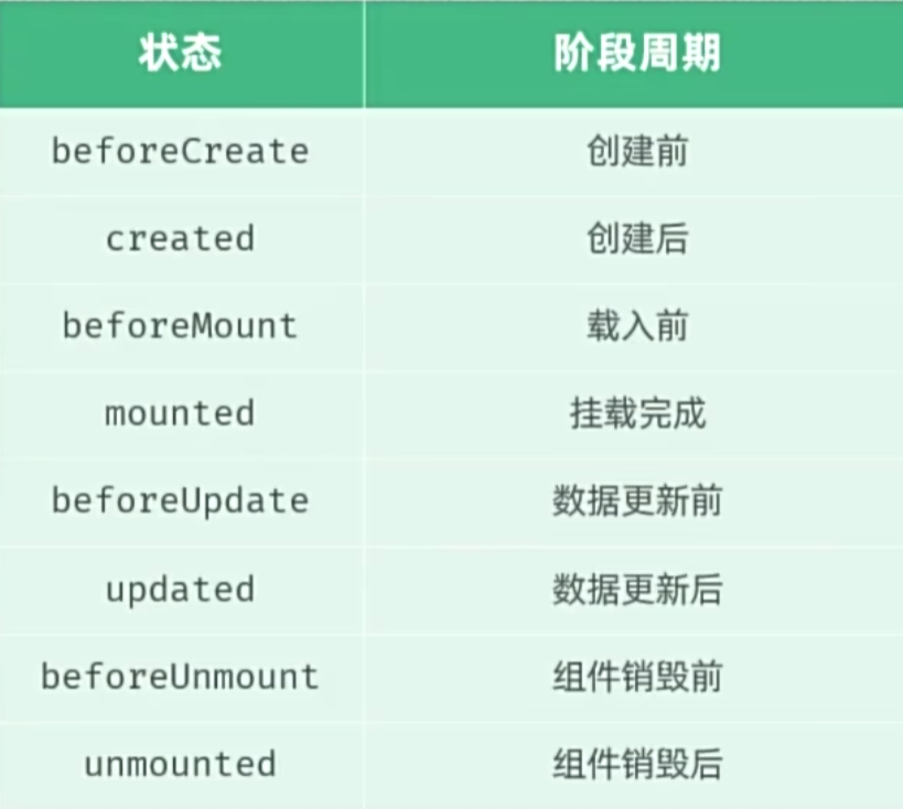 八个阶段:每触发一个生命周期事件,会自动执行一个生命周期方法(钩子方法)