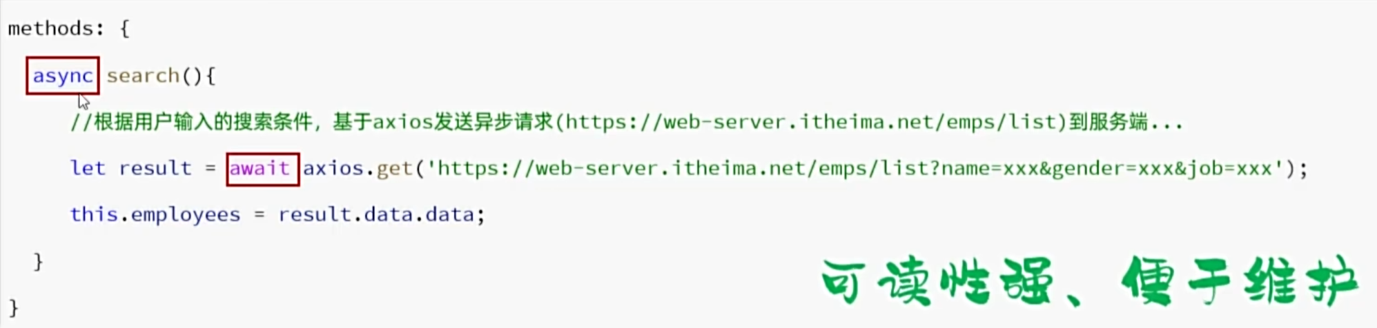 // axios.get('http://localhost:8080/emps/list?name=${this.searchForm.name}&gender=${this.searchForm.gender}&position=${this.searchForm.position}').then(function (response) {