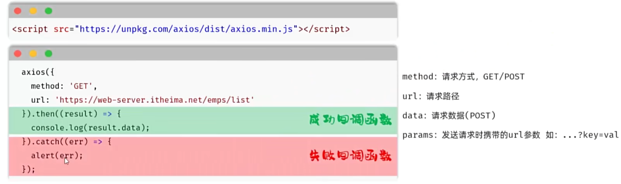 格式:axios.请求方式(url [, data [, config]])