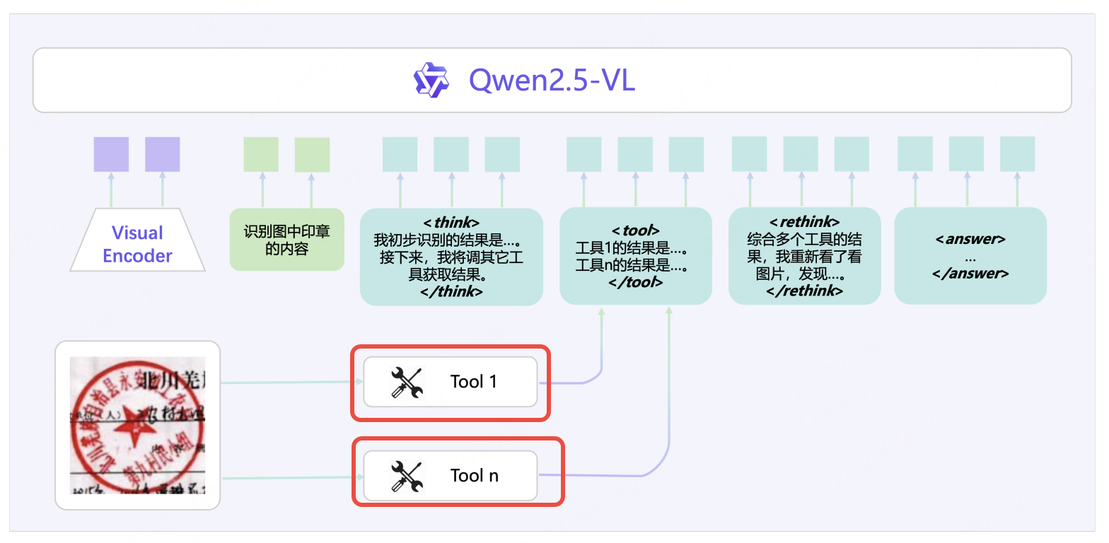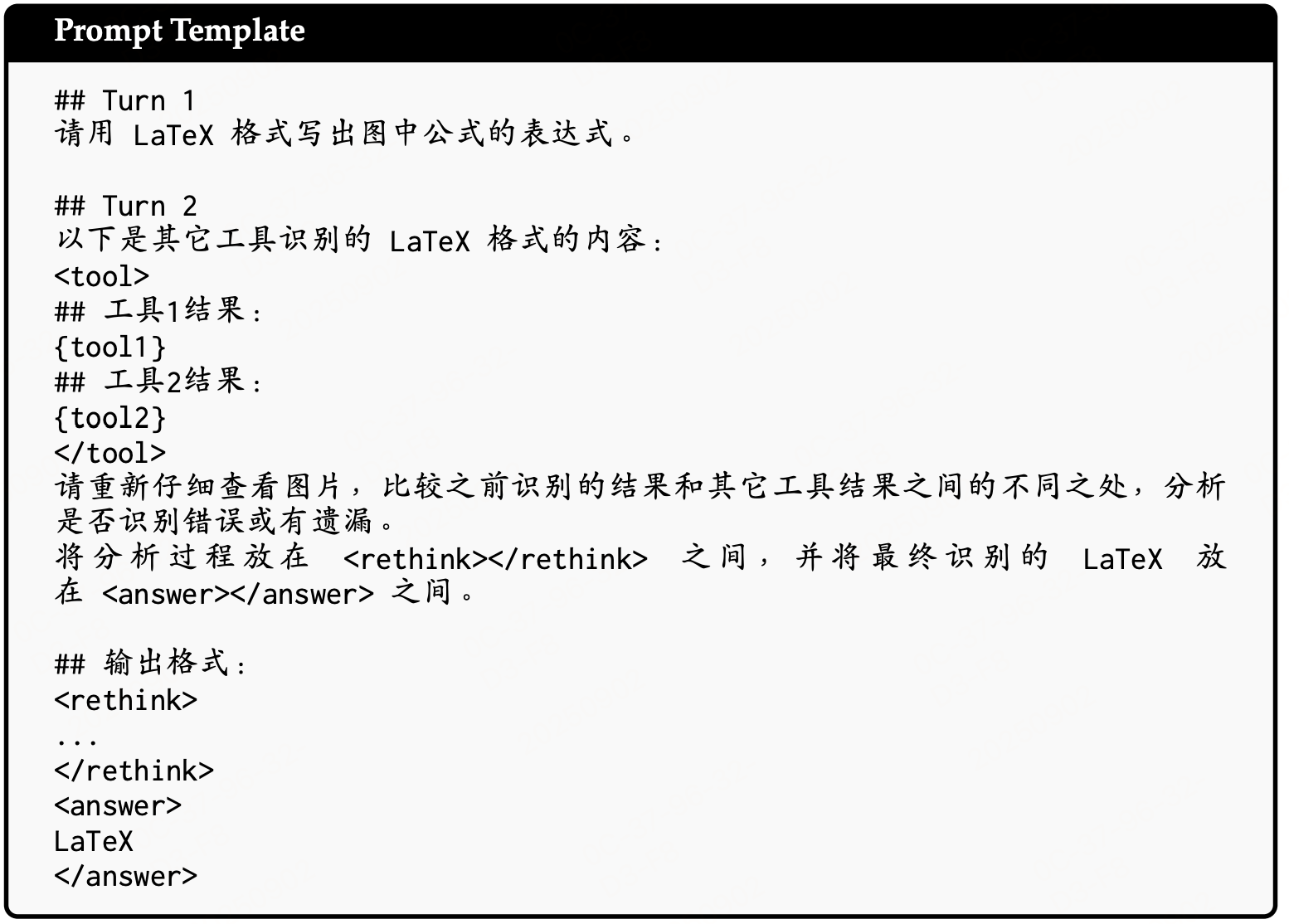 - 格式奖励:推理链需严格包含< recognition>、< tool>、< rethink>、`` 标签,且无额外内容 → 奖励 1.0;否则 → 奖励 0.0