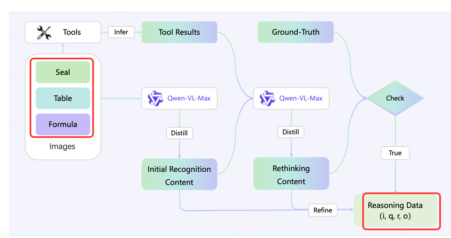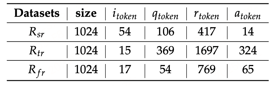 其中 R s r R_{sr} Rsr(印章推理数据集)、 R t r R_{tr} Rtr(表格推理数据集)、 R f r R_{fr} Rfr(公式推理数据集)的规模均为1024条样本(样本量均衡,避免某类任务过拟合);