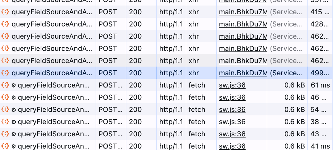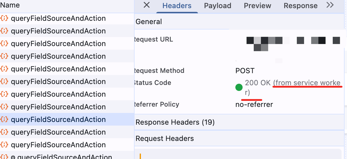 接口前有特殊图标或者实际的请求接口有 from service worker 表示成功。