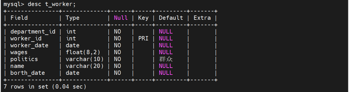 mysql> create table t_worker(