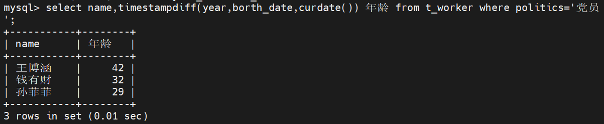 在t_worker表中,先查找是党员的人,再计算党员年龄,最后输出。
