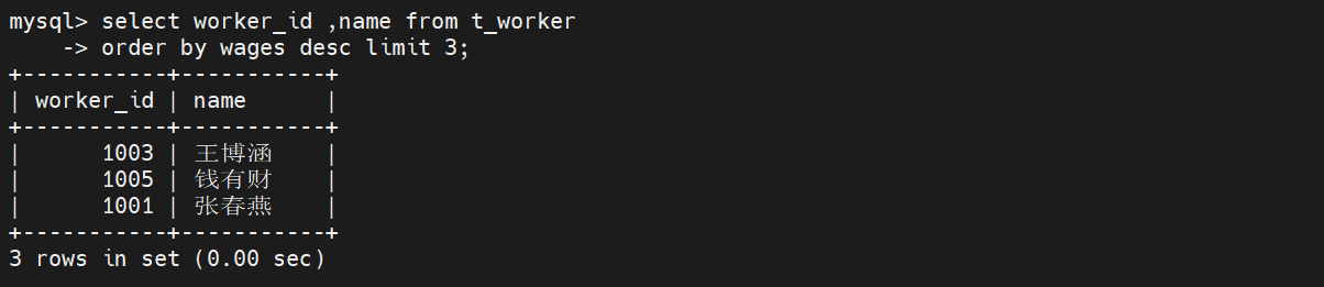 在t_worker表中,先降序排列工资,再返回前3行的结果,最后输出。