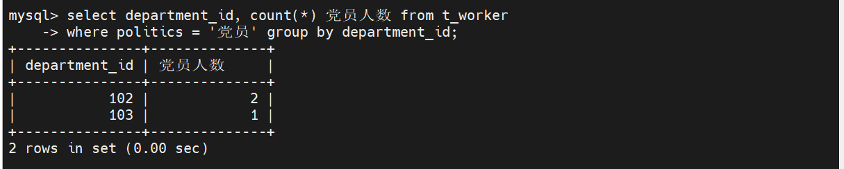 在t_worker表中,先查找是党员的人,再按照部门号分组,count()求出各部门的党员人数,最后输出。