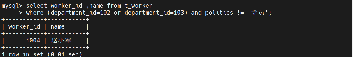 在t_worker表中,查找部门为102和103的人,不是党员,最后输出。