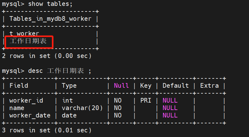 mysql> create table 工作日期表 select worker_id, name, worker_date from t_worker;