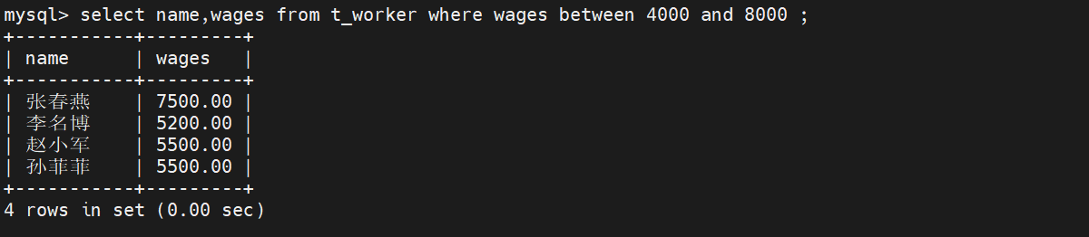在t_worker表中,查找工资在4000-8000之间的所有职工,最后输出职工姓名。