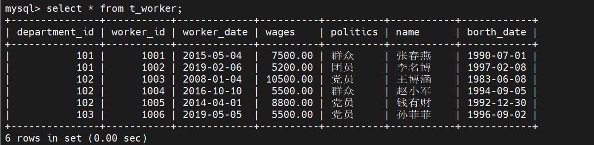 mysql> insert into t_worker values (101, 1001, '2015-5-4',7500.00,'群众','张春燕','1990-7-1'),