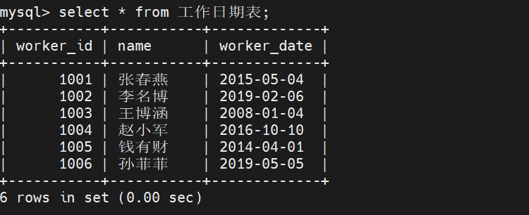 mysql> insert into 工作日期表 values(1001,'张春燕','2015-5-4'),