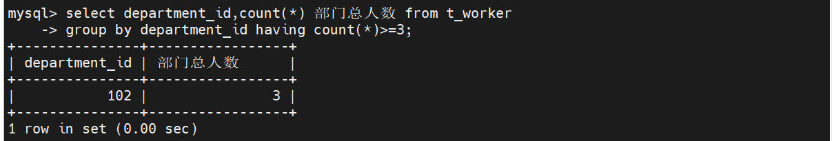 在t_worker表中,先按照部门号分组,再count()求出各部门的党员人数,having 过滤出部门人数>=3的部门,最后输出总人数大于等于3的部门号和总人数。