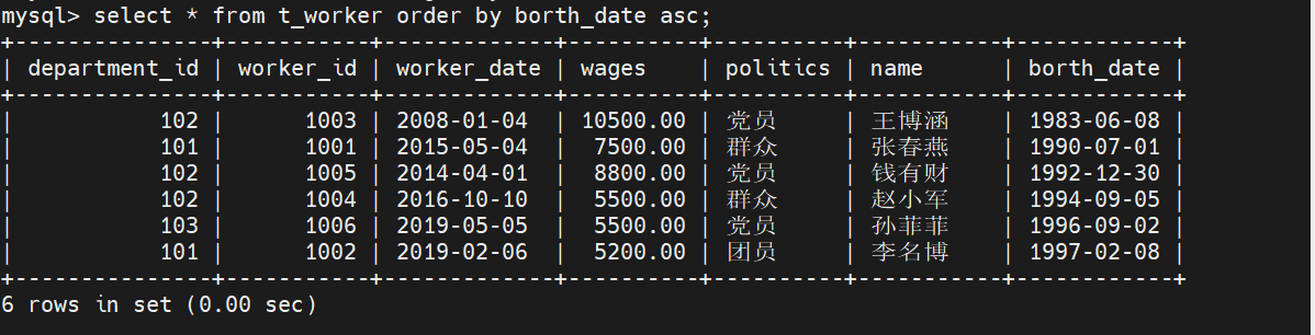 在t_worker表中,按照职工的出生日期升序排列,最后输出。