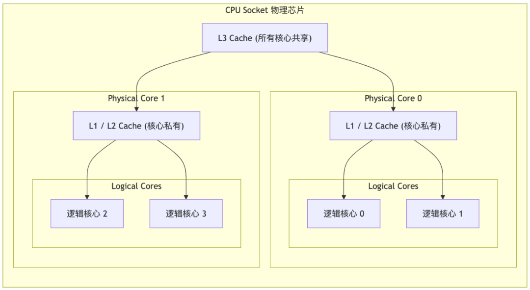 L1 和 L2 缓存是物理核心私有的。这意味着,不同物理核心之间的数据同步(例如,当核心0修改了某个数据,核心1也需要这个最新数据时),必须通过昂贵的、跨核心的**缓存一致性协议(MESI)**来进行,这是性能损耗的主要来源。