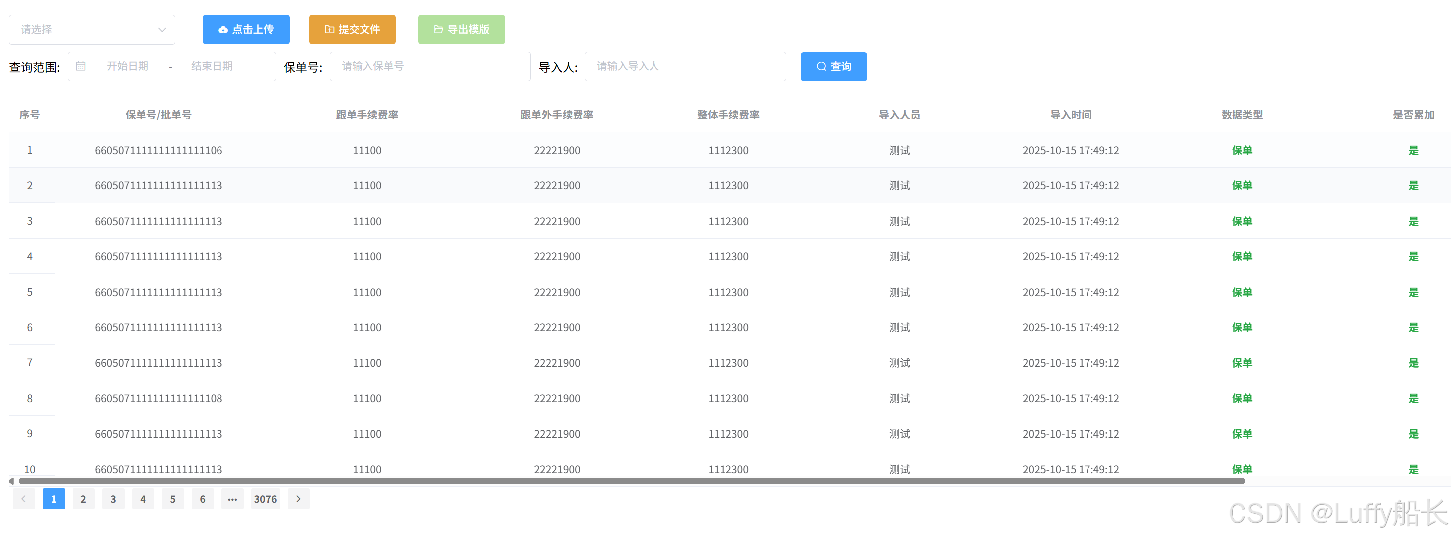 async submit() { if (this.tableData.length <= 0) { this.$message({ message: '请先选择一个Excel文件!', type: 'warning', showClose: true }); return; } // 检查是否选择了目标表 if (!this.tableNames) { this.$message({ message: '请先选择一个需要传入的表', type: 'warning', showClose: true }); return; } // 针对特定表的确认提示 if (this.tableNames === 'CONNECTION') { try { await this.$confirm( '此操作只能导入两年内的数据,大于两年的数据不做生效是否继续!', '提示', { confirmButtonText: '确定', cancelButtonText: '取消', type: 'warning', center: true } ); } catch (e) { this.$message({ type: 'info', message: '已取消导入!' }); return; } } // 显示加载状态 this.disable = true; const loadingInstance = Loading.service({ text: "正在上传数据", background: 'rgba(0,0,0,.5)' }); try { // 构造请求体,包含所有数据和表名 const requestData = { tableNames: this.tableNames, data: this.tableData // 整个数组一次性发送 }; // 发送POST请求 const response = await this.$axios.post('xxxx/aaaaa', requestData); if (parseInt(response.code) === 200) { this.$message({ message: '数据传输完毕!!!', type: 'success', showClose: true }); } else { this.$message({ message: response.msg || '上传失败', type: 'error', showClose: true }); } } catch (error) { console.error('数据异常:', error); this.$message({ message: "上传失败,请检查数据格式或网络连接!", type: 'error', showClose: true }); } finally { // 无论成功失败都关闭加载状态 this.disable = false; loadingInstance.close(); } },
