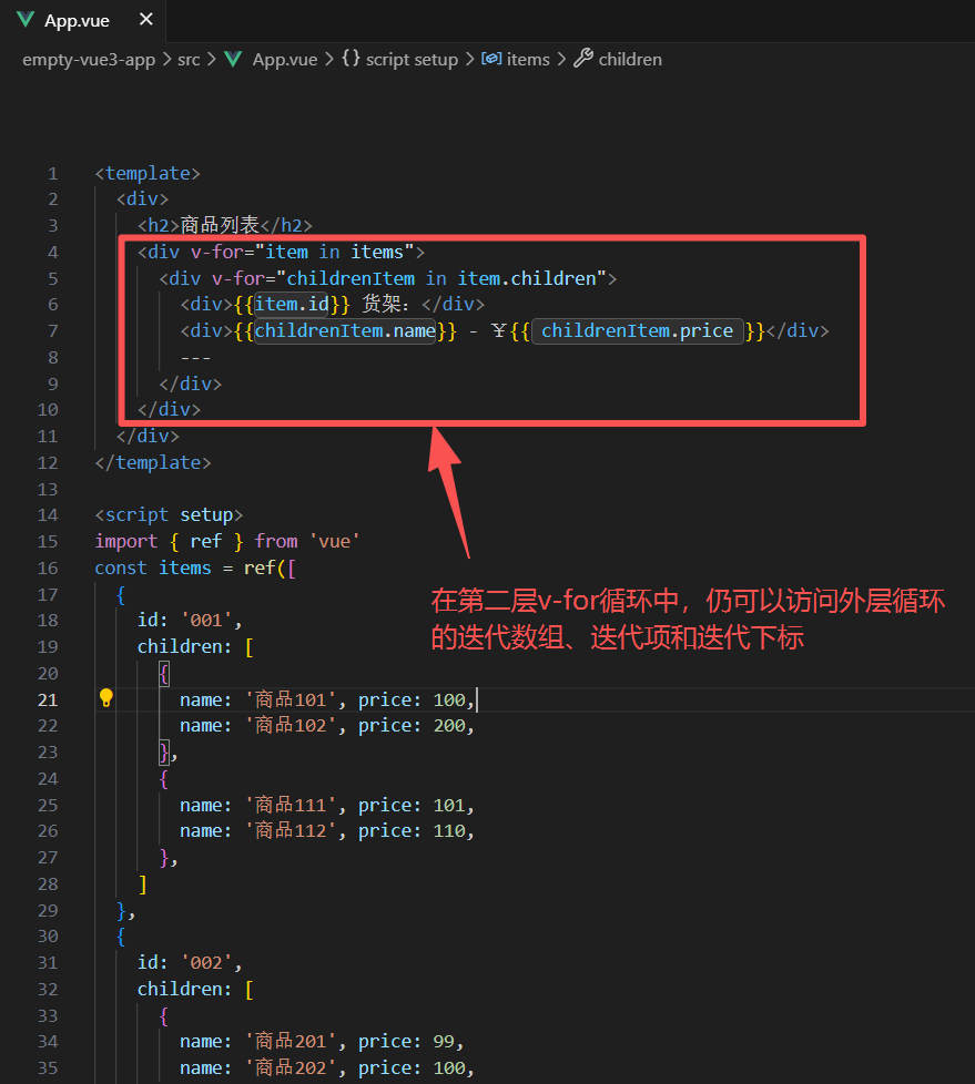 和函数作用域类似,多重嵌套 v-for 时,可访问到父级作用域的迭代源数组、迭代项和下标。比如: