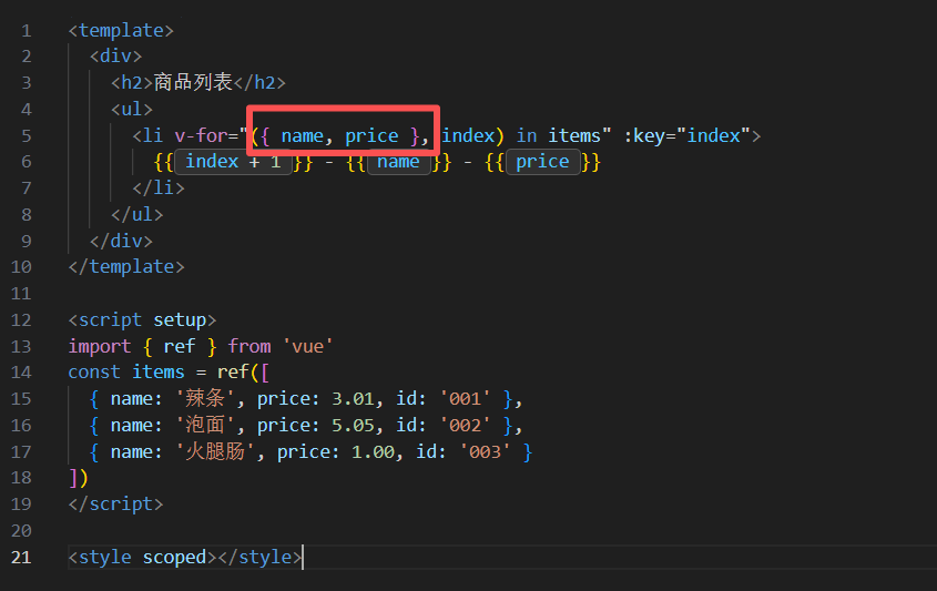 当迭代项是对象时,可以进行解构操作,方便取值。比如: